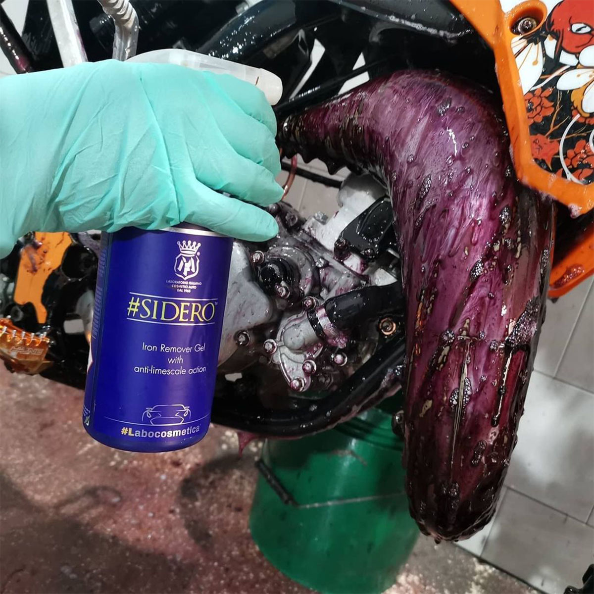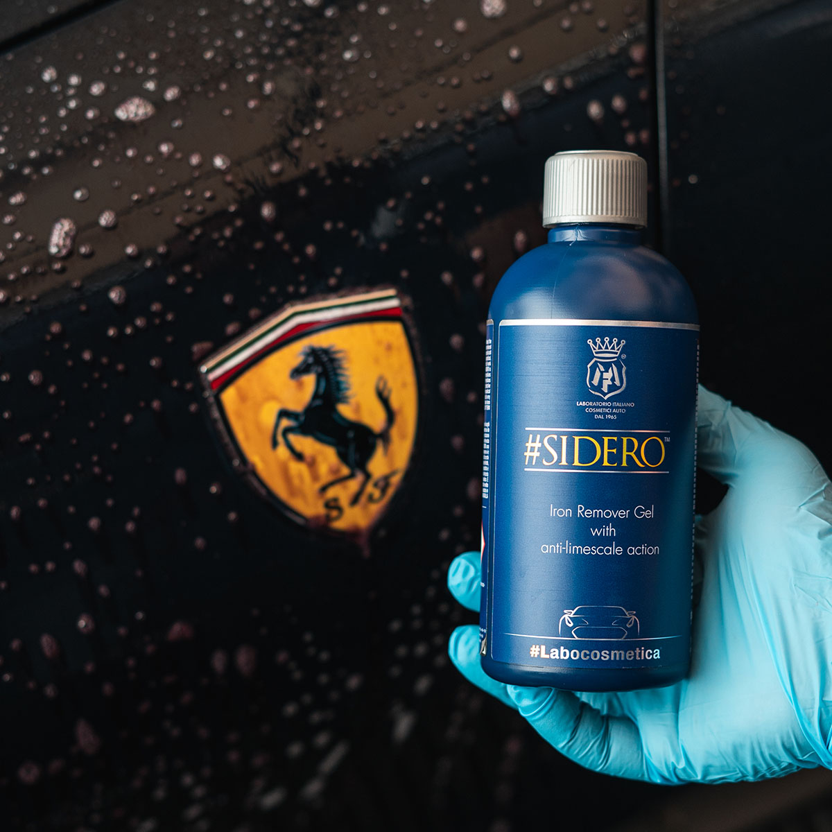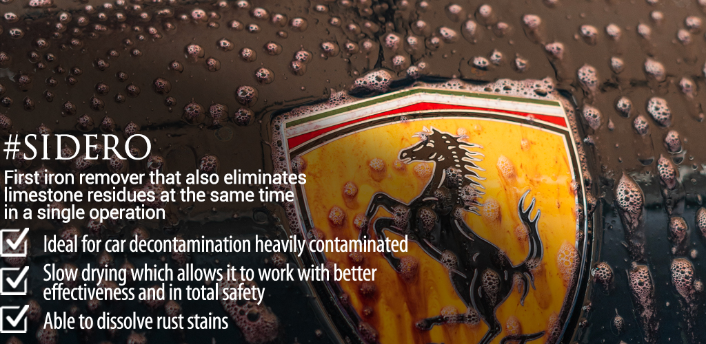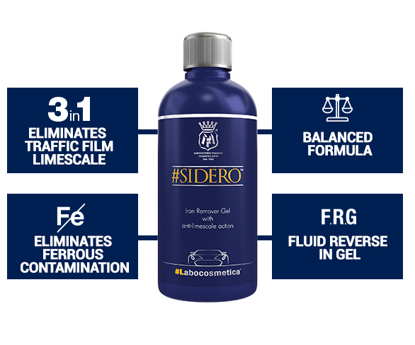 #SIDERO entsteht aus dem Bedürfnis von Fachleuten nach einem hochkonzentrierten und parfümierten Dekontaminierungsprodukt, das auch in Innenräumen ohne das Problem des für diese Produkte typischen störenden Schwefelgeruchs verwendet werden kann. #SIDERO ist ideal für die Dekontamination von Autos, die stark durch eisenhaltige Rückstände und Mineralien kontaminiert sind, die sich auf Karosserien, Felgen und Glas abgelagert haben, aufgrund des Transports auf der Schiene oder an Haltestellen in der Nähe von Stahlwerken oder Bahnhöfen oder durch Stadtverschmutzung und sauren Regen. Das Produkt verwendet das F.R.G. (Fluid Reverse in Gel), das selbst nach Verdünnung eine hohe Haftung auf vertikalen Oberflächen und eine komfortable, homogene und mühelose Abgabe ermöglicht, was für ein Gelprodukt ungewöhnlich ist.