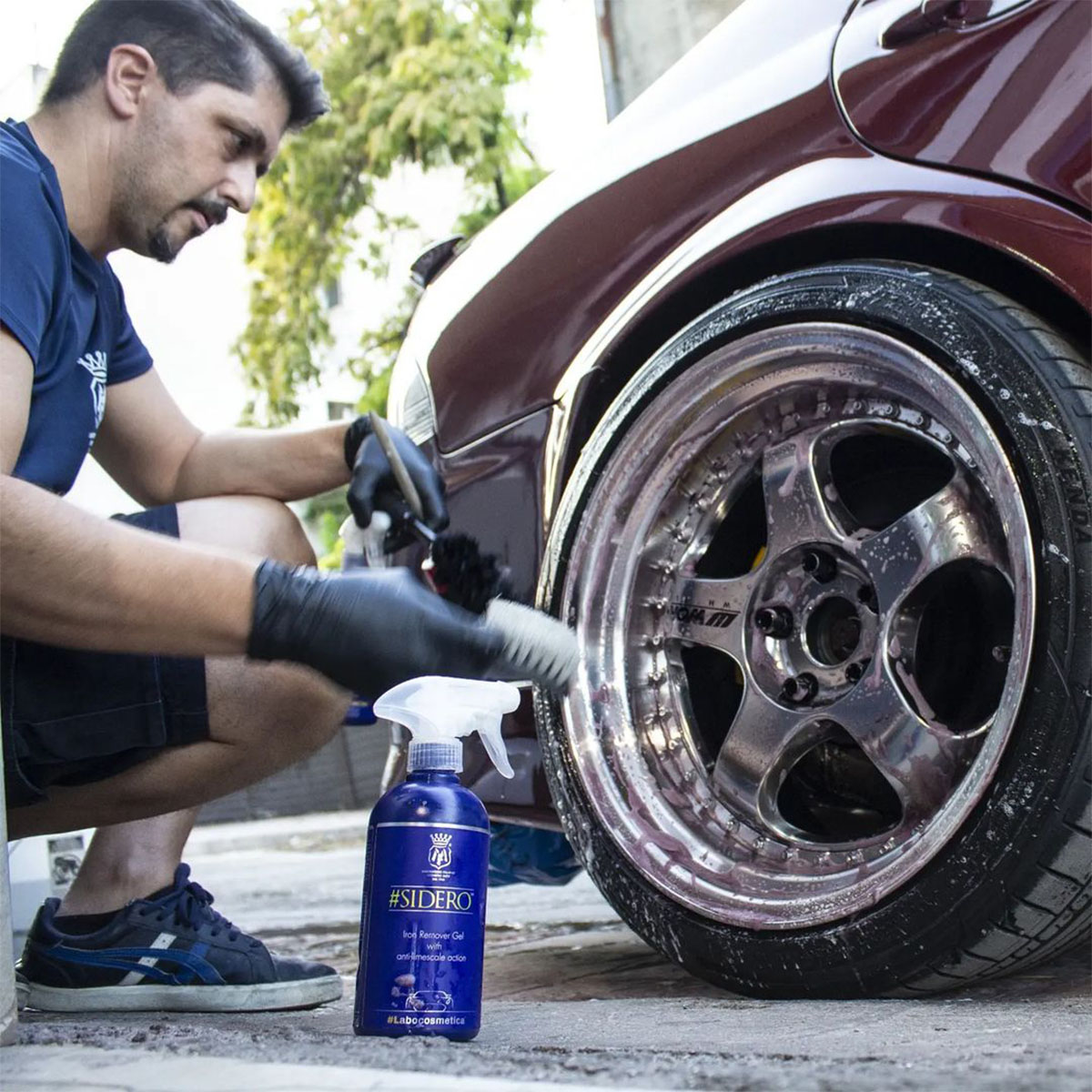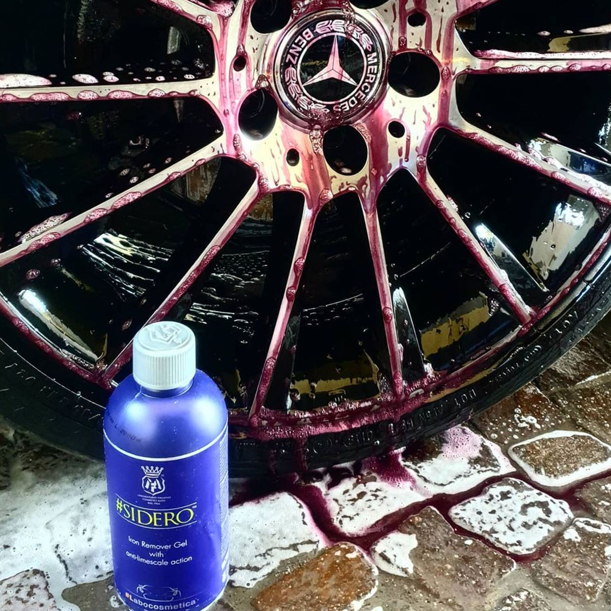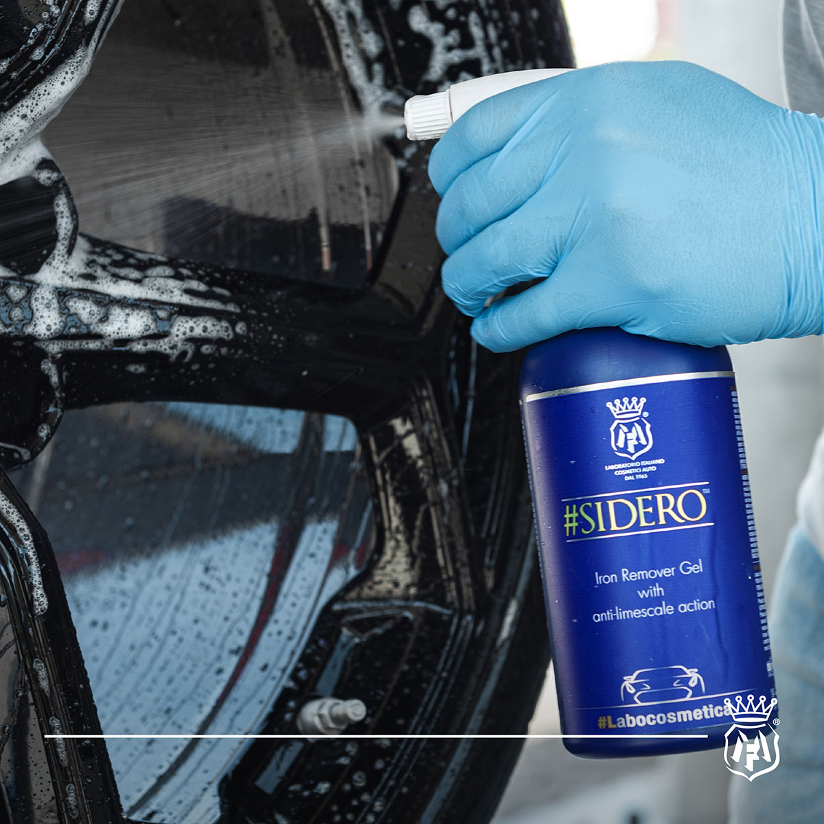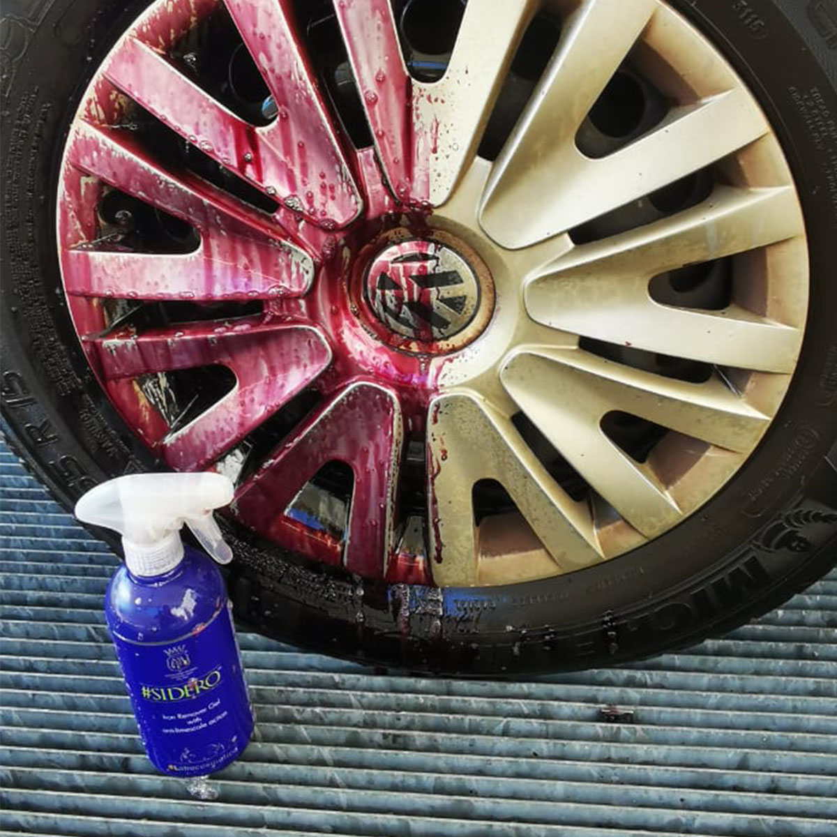#SIDERO einmal ausgegeben, zeichnet es sich durch eine langsame Trocknung aus, die es ihm ermöglicht, mit besserer Wirksamkeit und absoluter Sicherheit zu arbeiten, selbst in Situationen, in denen keine Möglichkeit besteht, das Auto von der Sonne weg zu dekontaminieren. #SIDERO ist stark geschmiert, um die Reinigung mit der Bürste in den Zwischenräumen von lackierten Felgen zu ermöglichen und mögliche Verwirbelungen zu vermeiden. Es ist auch der erste Eisenentferner, der in der Lage ist, gleichzeitig in einem einzigen Arbeitsgang sogar Kalkrückstände zu entfernen. Tatsächlich ändert sich seine Farbe bei mineralischen Rückständen von violett zu dunkelgrün – Bronze, um genau die Entfernung von Calciumrückständen anzuzeigen. Das Produkt ist inert auf der Karosserie, den Stoßfängern und den Kunststoffteilen und gibt dem zuvor aufgetragenen Schutz seinen ursprünglichen Abperleffekt zurück. Dank einer exklusiven und äußerst effektiven Mischung ist #SIDERO in der Lage, Rostflecken aufzulösen und wird aus diesem Grund auch für die Welt der Nautik empfohlen. Es ist wichtig für die außergewöhnliche Reinigung der Innenfelgen vor der Schutzbeschichtung.